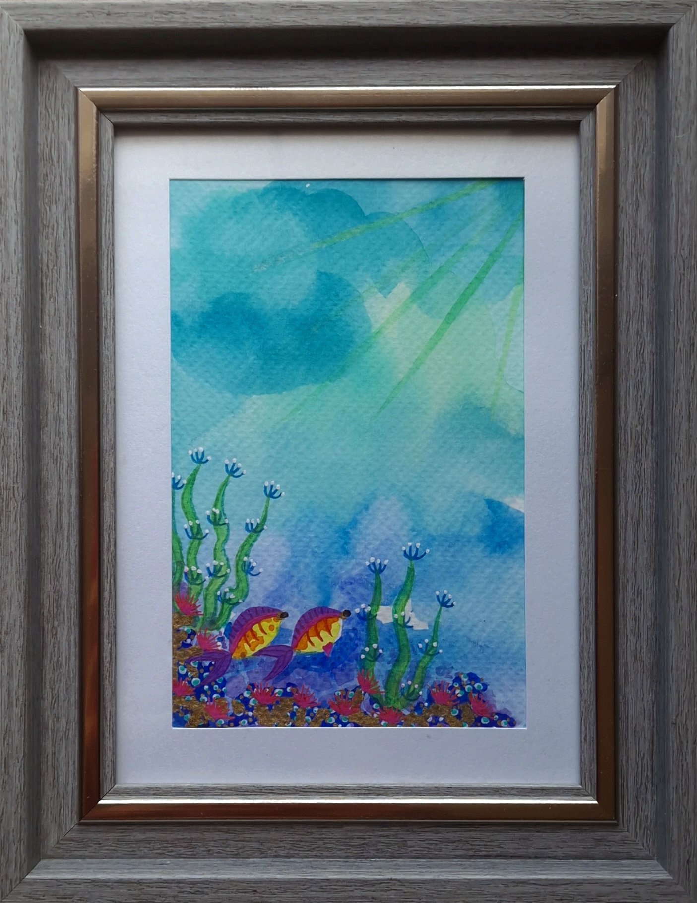 Watercolor with gel and gold, painted with oceanwater